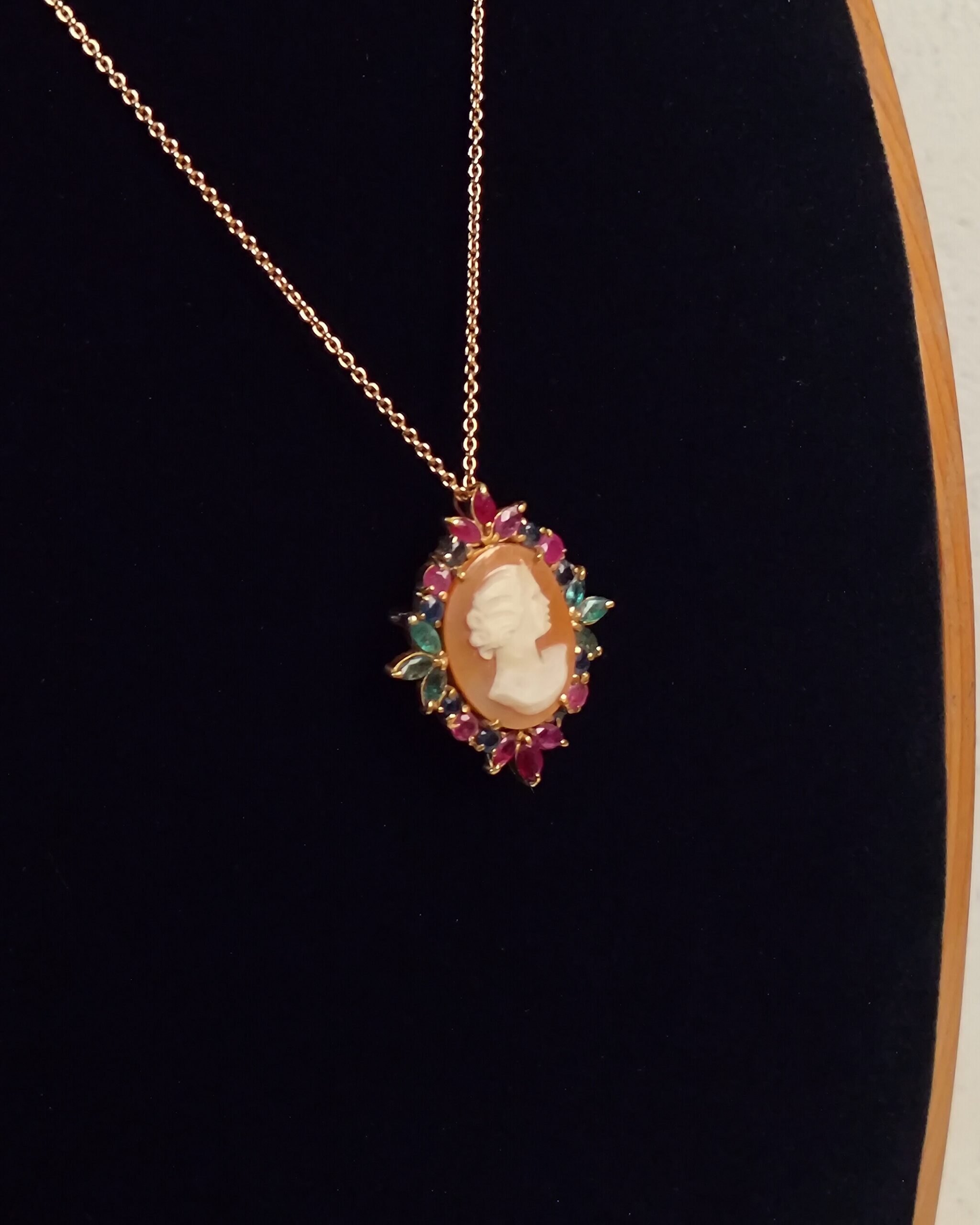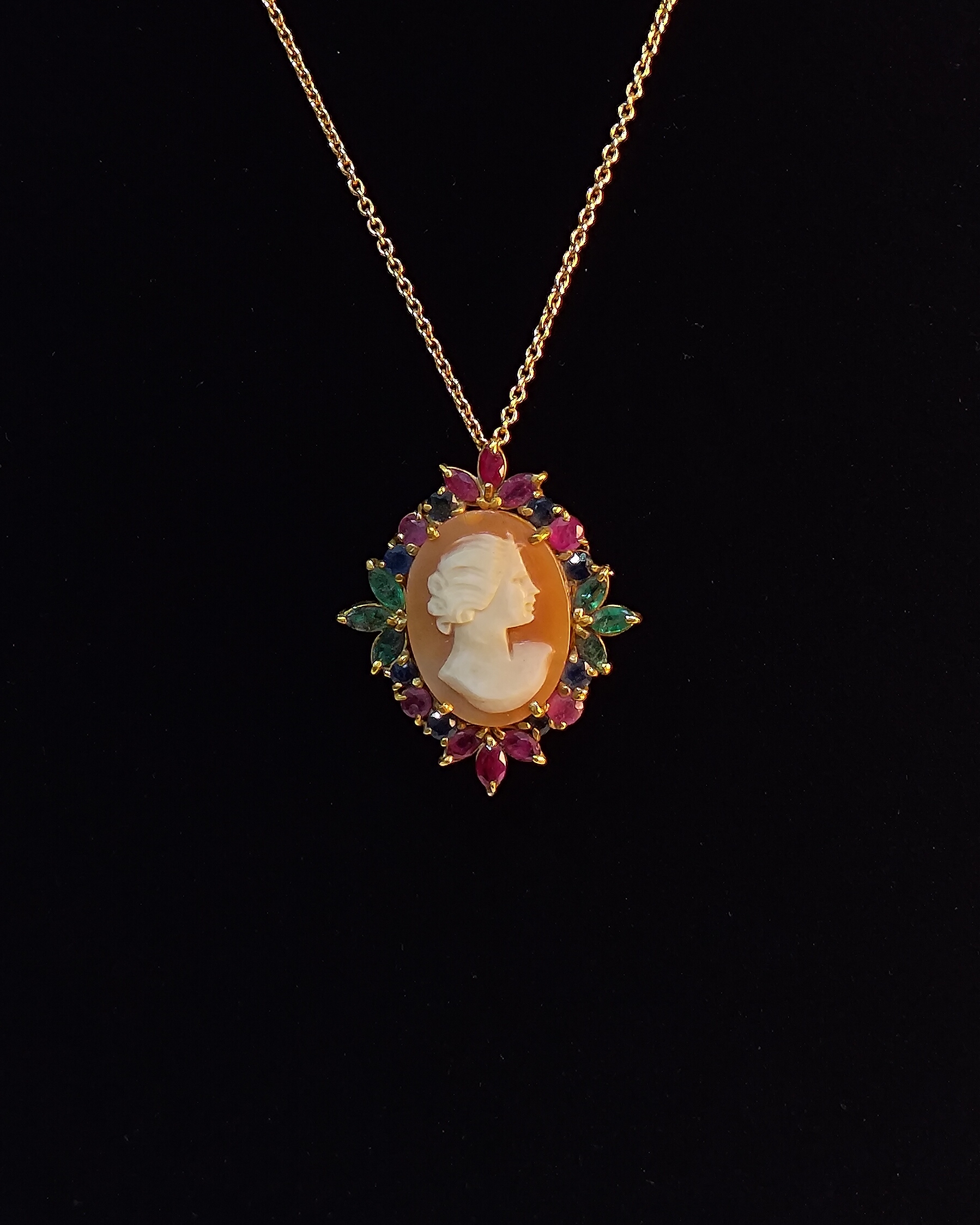 An 18K vintage yellow gold brooch-pendant with classic hand-carved shell cameo stone and multi-colored, marquise-cut natural stones (Ruby, Emerald and Sapphire)