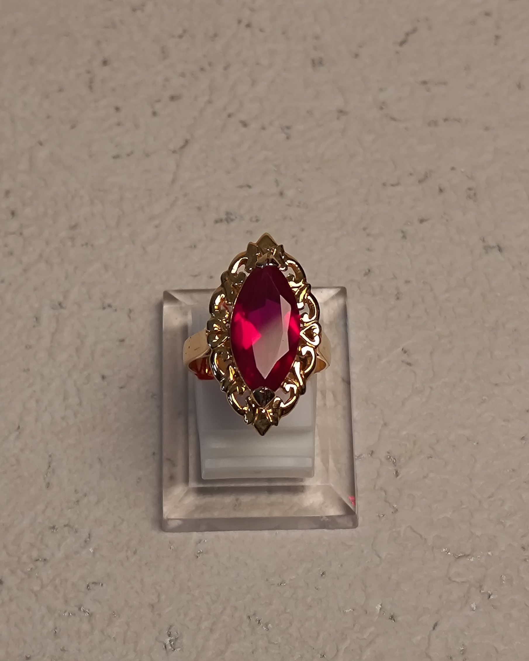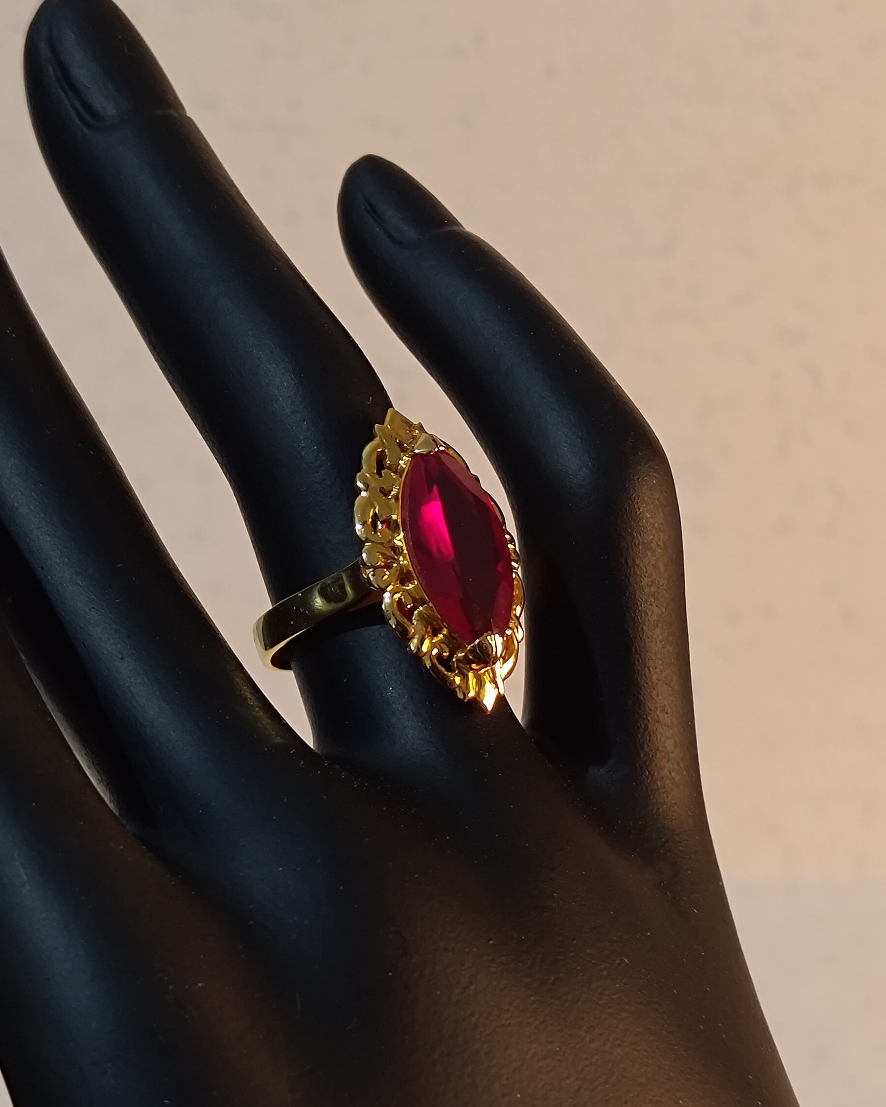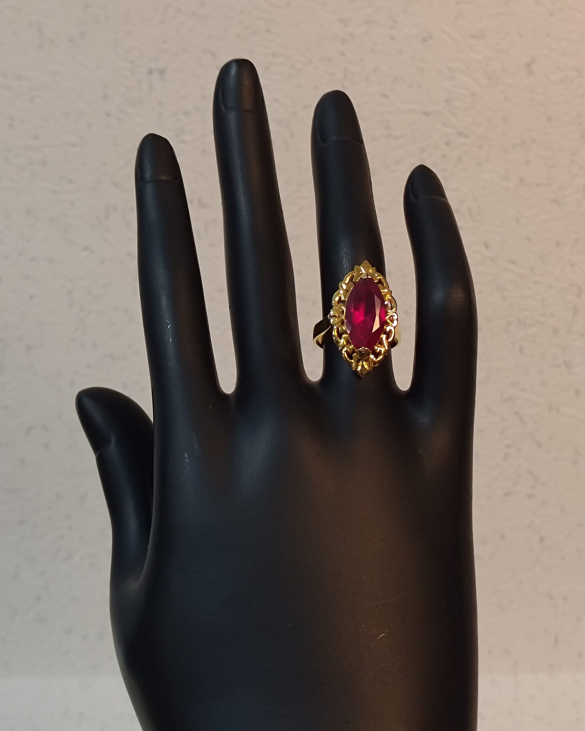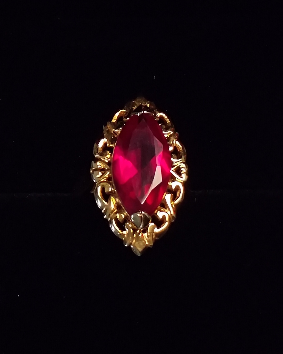 19K yellow gold marquise-cut red stone ring with ornate design.